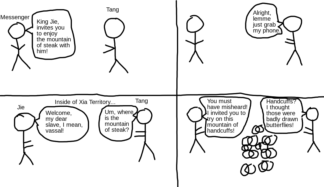 Sometimes, these comics tend to misrepresent the details of situations for comedic effect, but I feel that it is only right to relay the actual history here. Fearing the growing power of Tang, Jie had ordered him to come to the capital to meet him. As a vassal, Tang did not dare to disobey him, despite likely knowing the dangers. Jie had Tang arrested as soon as he arrived. Luckily, as established in the last blog post, Jie had a critical weakness!