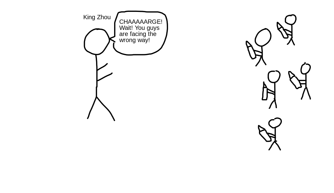 When King Wu of Zhou had gathered support not only from other vassal states of the Shang, but even from many nomadic tribes that were the bane of the Yellow River Valley, he set out to capture the Shang capital. King Zhou, having sent the bulk of his army on another one of those campaigns against the nomadic tribes, was suddenly left with no army with which to defend his capital. He thus immediately ordered that all slaves and prisoners within the capital be released and armed. With this massive army of reluctant fighters, he set out to face the incoming threat at the fields of Muye (牧野).