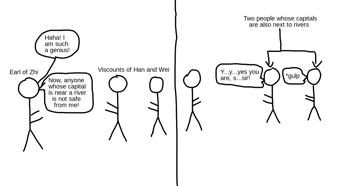 As nightfall came, the besieged Zhao, in desperation, sent an envoy to Han and Wei, begging them for help. The envoy reminded the Viscounts that their capitals were next to rivers, and thus were just as vulnerable as Jinyang to a Zhi attack. Convinced by the envoy’s reasoning, and already fearing that possibility, the two Viscounts accepted a secret pact with Zhao. As the Earl of Zhi slept soundly in his tent, engineers from the three Viscounts’ armies snuck down to the river, and quickly eradicated the barricades protecting the Zhi camp. The water, which seemed like a monolithic tower bearing down on the besiegers even from afar, suddenly reversed direction, rushing down upon the Earl’s forces.