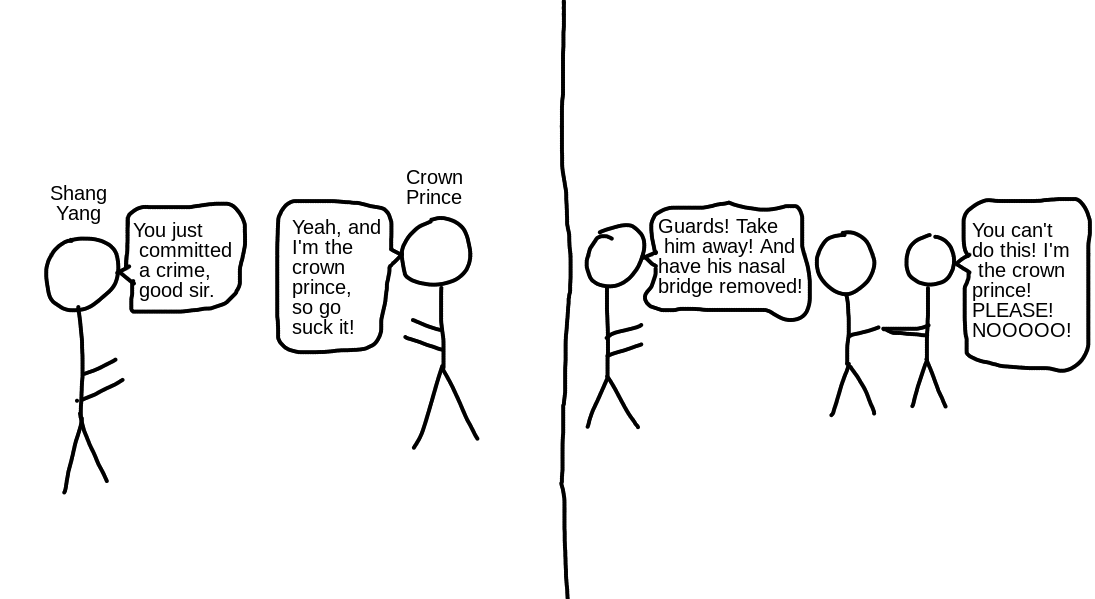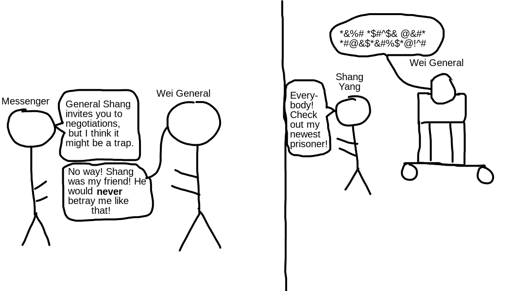 There was once a young, low-level official from Wei named Shang Yang (商鞅). Attracted to Qin by its openness to new talent, Shang got an audience with the Duke himself, allowing him to dazzle Duke Xiao with his vision for the future. Duke Xiao, thoroughly impressed, immediately made him high chancellor.