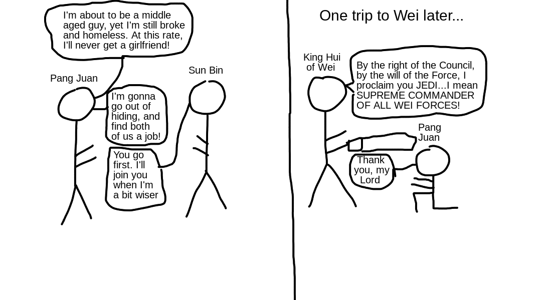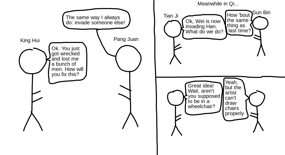 For the next quarter-century, Wei and Qi would be similarly powerful, and would compete for preeminence in the country. Their power struggle would closely follow the paths of Pang Juan and Sun Bin.