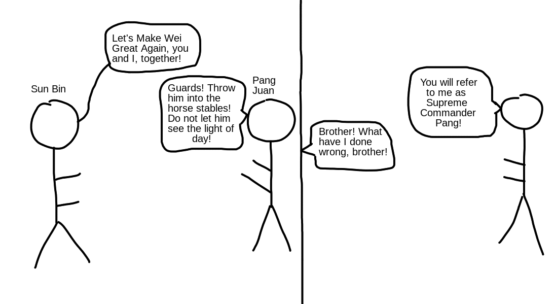 But Sun was resilient and intelligent. He eventually came to realize that if he submitted to the agony and put his knowledge onto paper, then his former friend would have no reason to keep him alive. So, he began to fake his own insanity. When Pang threw him into the horse stables, he began eating the manure and loudly declaring its tastiness! Seeing this, Pang gave up, and the torture stopped. But Pang never killed Sun. It was not necessary to eliminate an insane man who couldn’t even walk. “What threat could he possibly pose?” Pang thought to himself. “When was the last time a guy who liked eating poop turned out to be an actual threat?” (for all those who read the previous blog post, this is called…a callback!)